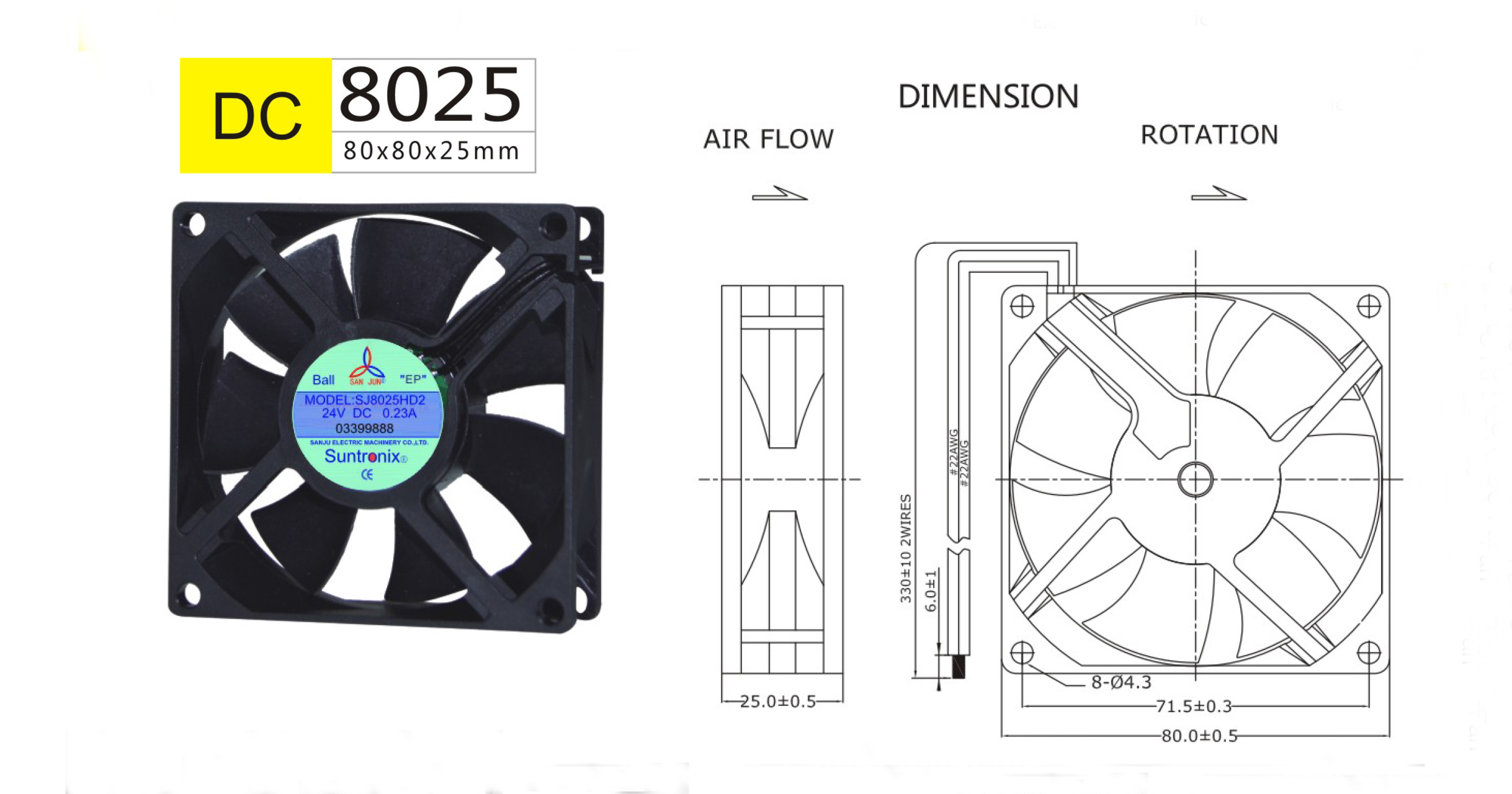 尺寸:80x80x25mm 框架: UL94V-0 PBT 軸承: 含油軸承& 雙滾珠軸承 電壓:DC 5V 12V 24V 48V 壽命:50 000Hours at 25℃--滾珠軸承 30 000Hours at 25℃--含油軸承 工作溫度:-20℃~70℃ 正常濕度 儲存溫度:-20℃~85℃ 正常濕度